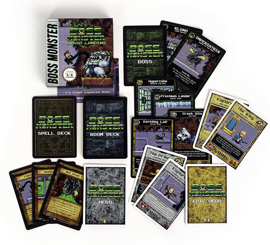 An alien spaceship has crash landed in the world of Arcadia! Expand your Boss Monster game with this mini-expansion for 5-6 players. Crash Landing introduces an all new treasure type, new heroes, new Bosses, and new rooms powered by alien monsters and technological traps never before seen in the world of Boss Monster!