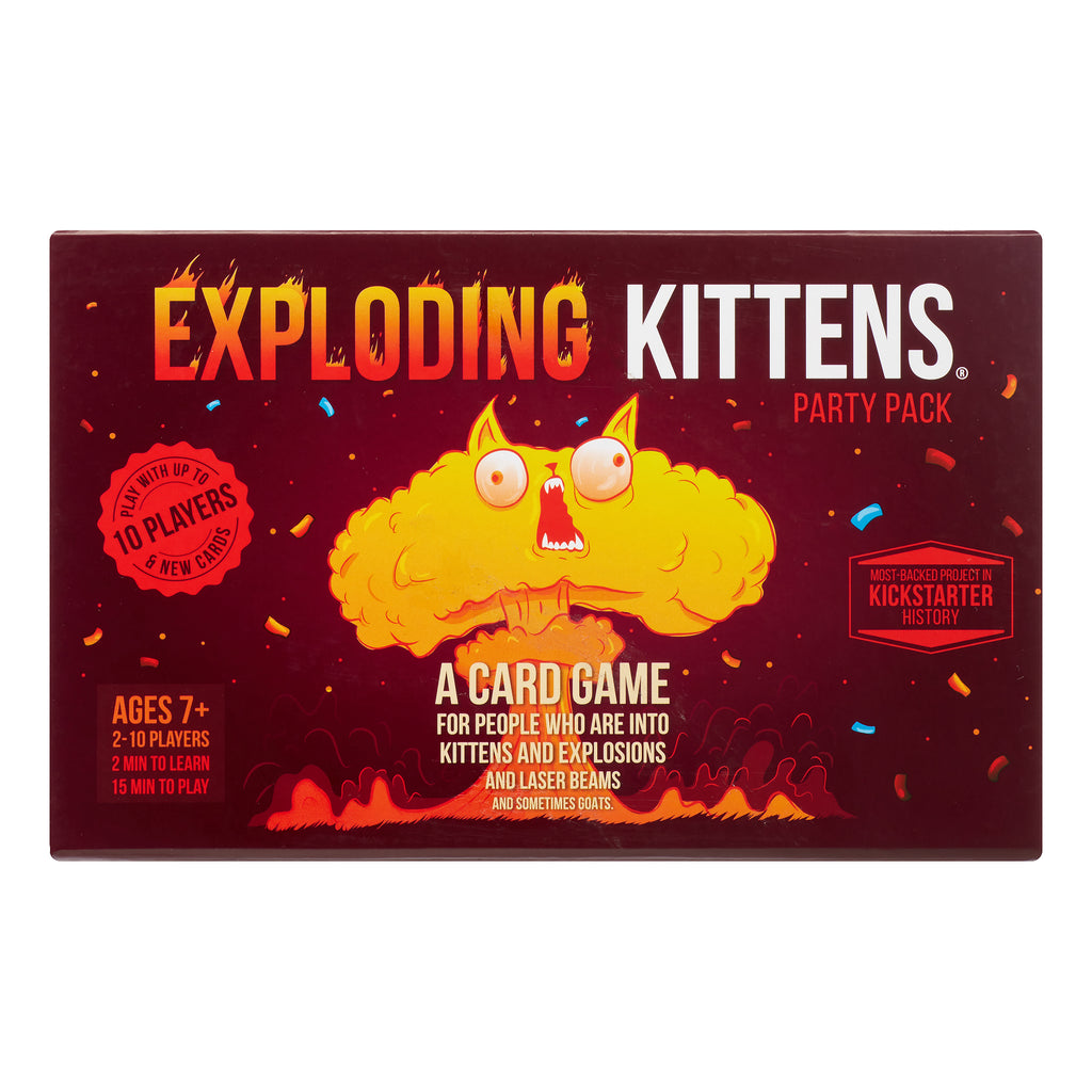 This Party Pack version of Exploding Kittens is still the same family-friendly, easy-to-learn card game as the original, but we've chosen some of our favorite cards from Exploding Kittens and the Imploding Kittens expansion deck to let you play with up to 10 players! In this highly-strategic, kitty-powered version of Russian roulette, players draw cards until someone draws an Exploding Kitten, at which point they explode, they are dead, and they are out of the game unless that player has a Defuse Card, which calms the volatile kittens using things like laser pointers, belly rubs, and catnip sandwiches. All of the other cards in the deck are used to move, mitigate, or avoid the Exploding Kittens. Exploding Kittens is the most-backed crowd funded product in history…which we hate to brag about.