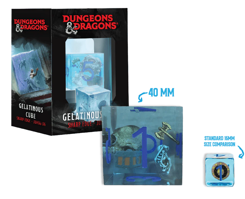 One of the most famous monsters in D&D lore comes to life in our officially licensed D&D Jumbo Gelatinous Cube. This giant sharp edge resin dice displays the results of a deadly battle including bones, treasure chest and giant monster skull all in an extra large 40mm Jumbo Gelatinous Cube d6! Features amazing detail and is an incredible desk piece!